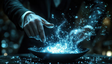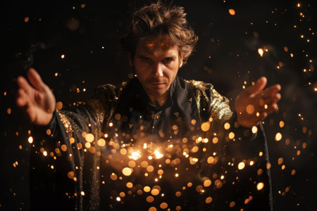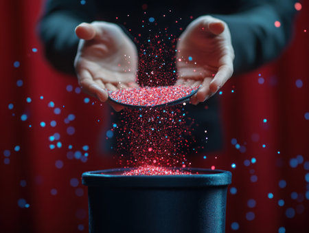A magician performs a captivating illusion with sparkling particles in a dimly lit theater during an evening show