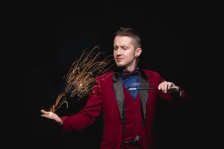 Illusionist white hand wants to conjure with magic wand from a black cylinder something .