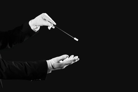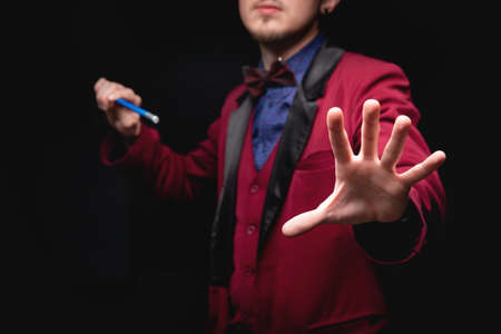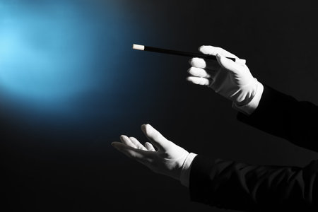 performance, circus, illusion and show concept - magician hands in white gloves with magic wand showing trick