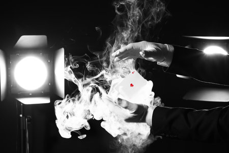 A magician in formal attire showcases card manipulation skills while surrounded by a smoky, dimly lit environment. He holds two playing cards, captivating the audiences attention.