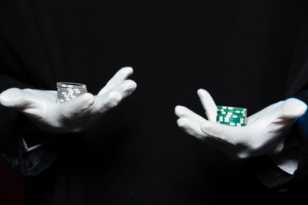 Hand gestures. Showman or magician illusionist in white gloves on a black background.