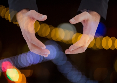 Digital composite of Hands holding invisible space with sparkling light bokeh background