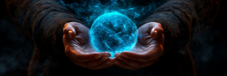 Mysterious Blue Orb Held in Hands, Magic, Energy, Mystical Powers, Dark Background, Sorcery Concept