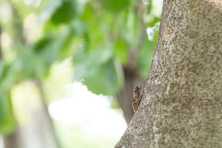 Cicada stick resting on a tree in Thailand's park, displaying its amazing musical talents and enjoying a tropical climate.