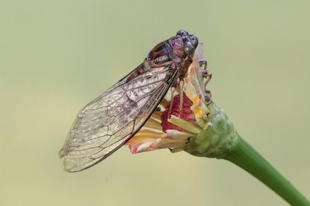 Brood X group of periodical cicadas emerge synchronously every 17 years. This group is known as Great Eastern Broods. Newly emerged adult swinging wing before flying off a wooden stick