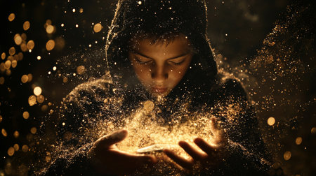 A young boy in a hoodie holding glowing golden particles in his hands, surrounded by a mystical atmosphere with floating sparkles against a dark background.