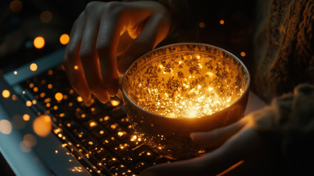 Highlighting the freelancers hands the scene focuses on a laptops illuminated keys and a porcelain coffee cup adorned with intricate designs establishing a balance between work an