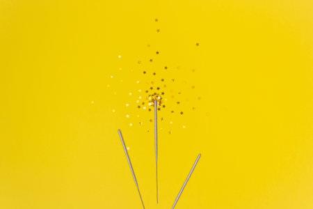 Confetti stars and sparkler sticks on a yellow background. The view from the top.