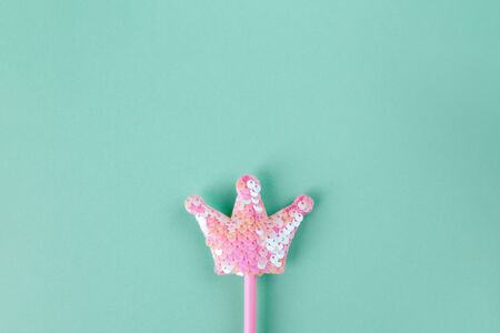 golden magic stick from sequins in crown shape on blue and pink glitter background. Creative flat lay close up