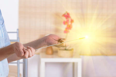 Changing the television with magic wand for fantasy shot with selective focus