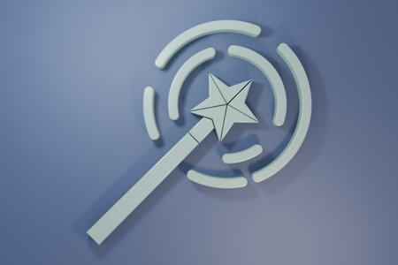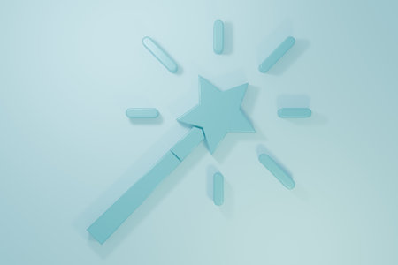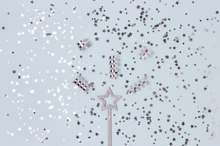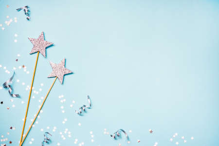 Glittering magic wand with silver colored confetti on a blue pastel background.