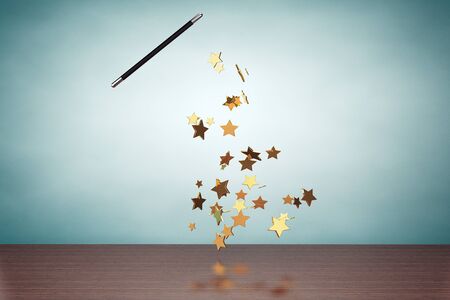 Glittering magic wand with gold colored confetti on a beige background.