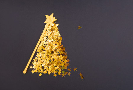 Abstract Christmas tree made of gold stars on a dark background with space for text. Postcard template.