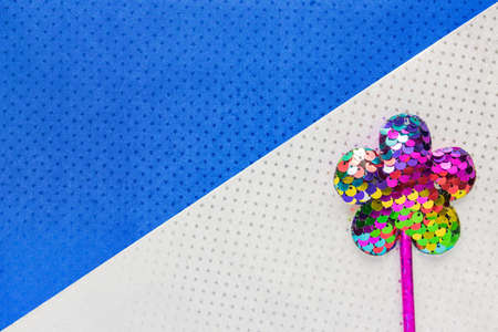 magic stick from sequins in flower shape on blue glitter background. Creative flat lay close up