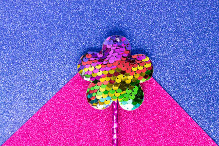 magic stick from sequins in flower shape on blue and pink glitter background. Creative flat lay close up
