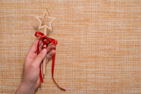 Person holding magic wand in hand against red