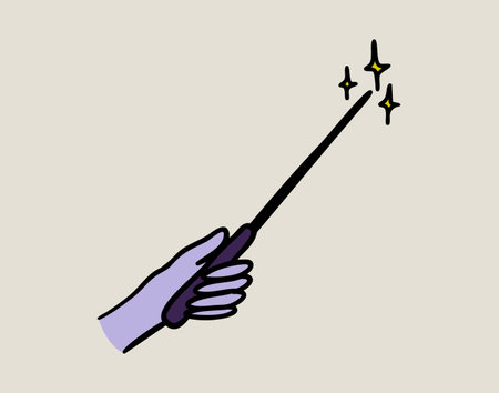 Hand holding magic wand with stars, boho mystical witchy hand drawn style