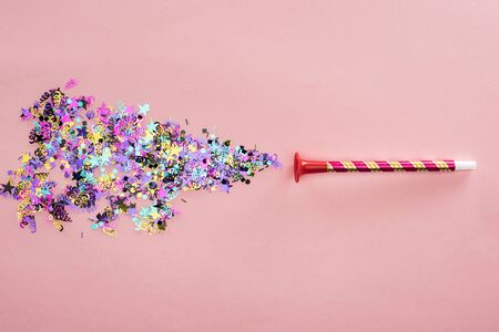 Party horn and multicolored confetti on pink background