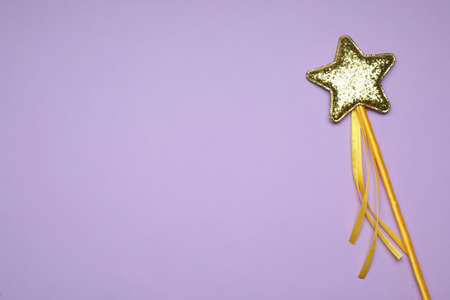 Beautiful golden magic wand on lilac background, top view. Space for text