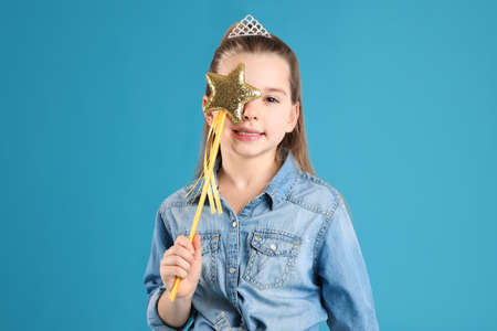 Cute girl in diadem with magic wand on light blue background. little princess