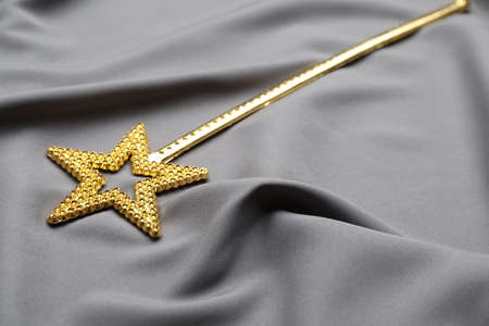 Beautiful golden magic wand on gray fabric