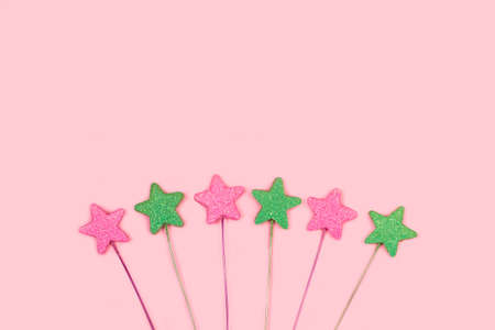Shiny pink and green decorative stars on a pink background with copy space