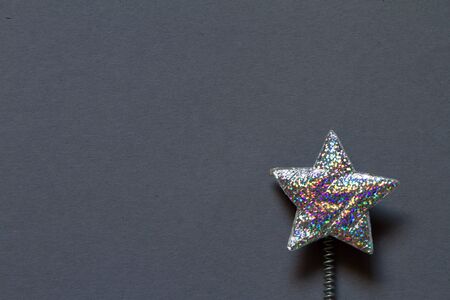 Close up silver glitter plastic star with spring on gray background, minimalistic concept or background