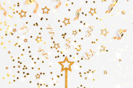 Glittering magic wand in a star shape with golden confetti. Festive concept on a white background.