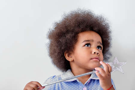 cute kid girl with dark skin, mixed race child playing with magic wand, looking up, having beautiful fluffy curly hair. isolated on white studio background. childhood, lifestyle concept