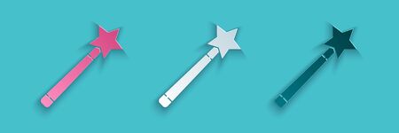Paper cut Magic wand icon isolated on blue background. Star shape magic accessory. Magical power. Paper art style. Vector Illustration