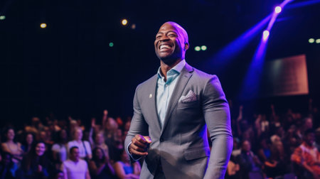 African american man motivational speaker on stage, talking about success and leadership. Generative AI.