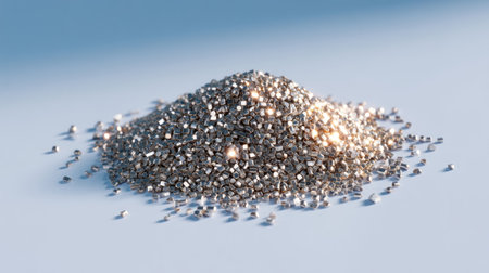 A detailed view of fine silver granules arranged in a mound, highlighting their shine and texture, perfect for crafts or jewelry design and showcasing precious metal use.