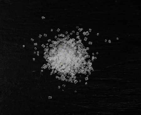 Big sugar crystals on black background close up. Macro shot of sucrose crystals, sea salt rock or granulated sodium salt texture on food slate top view