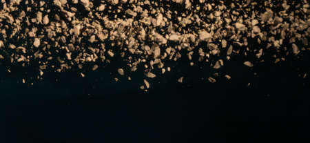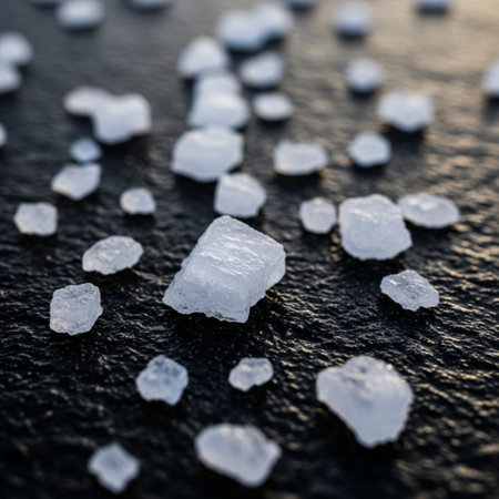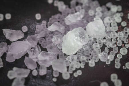 Crystals of sea salt on dark background. Closeup view of important food mineral.