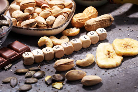 Healthy food nutrition dieting concept. Assortment of high magnesium sources.