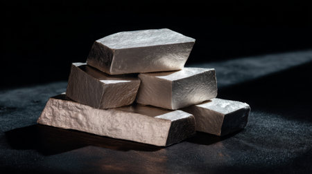 A visually striking image featuring a stack of metallic blocks arranged on a dark surface, illuminated by soft light that enhances the texture and sheen.
