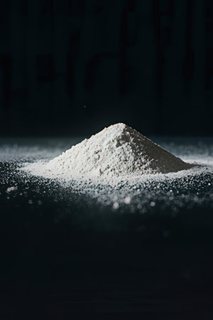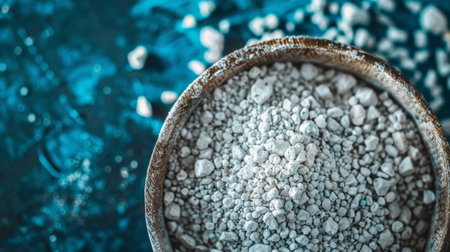 A macro shot of fine white granules in a wooden bowl on a textured blue background. Ideal for minerals, raw materials, or natural resources concepts.