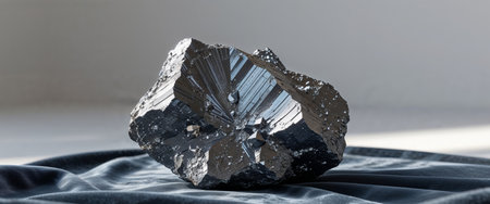 AI Generated. Tight shot of a highly magnetic meteorite sample with visible streaks of iron and nickel small crystals glinting as it rests on a dark velvet surface