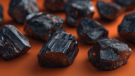 Numerous dark rocks with metallic textures are arranged against a warm orange background. The image exhibits a shallow depth of field, highlighting the rough surfaces and natural shapes. The composition features directional lighting and could be suitable for illustrating concepts related to geology or mineralogy, and could be utilized for various commercial purposes.