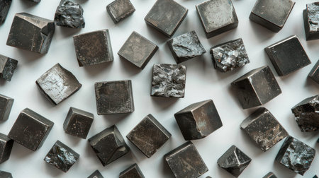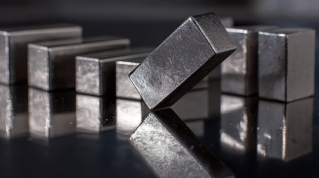Close-up of metallic blocks arranged on a glossy surface, showcasing their shine and reflection. The image captures the industrial essence and minimal design, perfect for creative projects.
