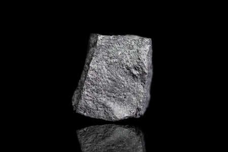 Macro Close up image of raw material Platinum and Chrome Ore rock isolated on black reflective background