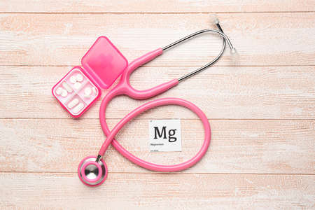 Plastic container with pills, stethoscope and word MAGNESIUM on grunge background