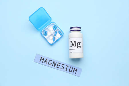 Plastic container with pills, bottle and word MAGNESIUM on color background