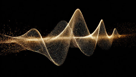 An abstract digital illustration showcases a flowing wave form composed of numerous golden particles. The dynamic design features curving lines with variations in density and brightness, set against a dark backdrop. Suitable for a wide range of uses, this image could enhance presentations or add visual appeal to various design projects.