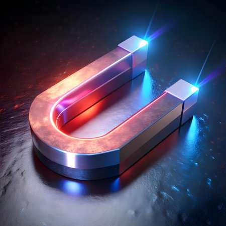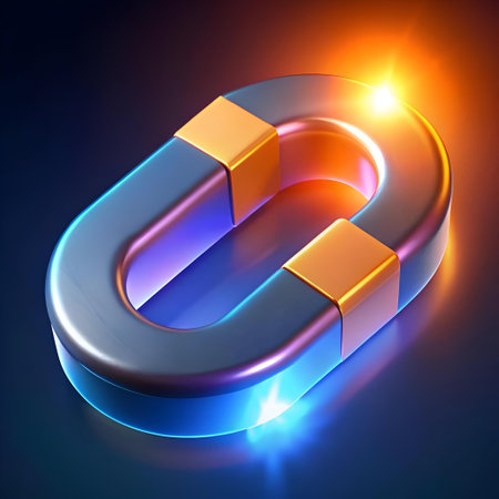 A 3D rendering of a shiny metallic horseshoe magnet with glowing blue and orange accents. Perfect for concepts of attraction. power. and connection.