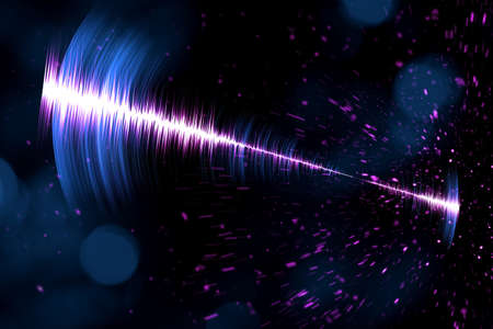 A dynamic abstract visualization of bright blue light waves and glowing particles radiating outwards from a central, intense light source against a dark background.