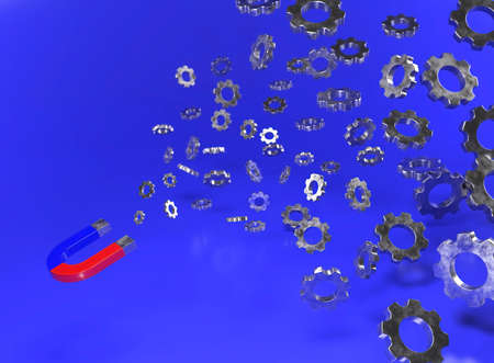 Iron magnet and flying gears on a blue background, 3d illustration.