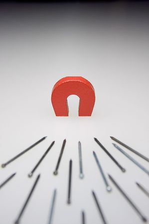 A small magnet with a stack of brads demonstrating attraction