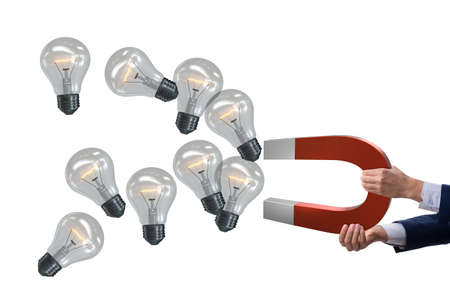 A magnet attracts a glowing idea light bulb. The concept of choosing best idea from presented ones. Developing startup. Business accelerator. Innovation, fresh ideas. Purchase of technologies patents.