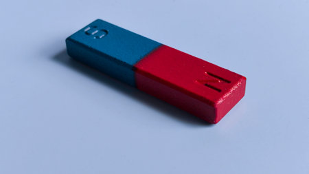 Blue and Red Magnet with North and South Pole Signs on Blue Background Representing Magnetic Force, Attraction, and Polarity